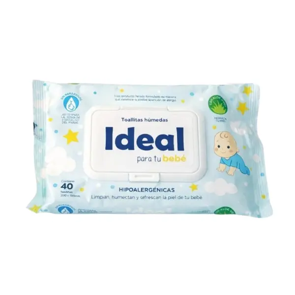 Las Toallas Húmedas Ideal son hipoalergénicas, limpian, humectan y refrescan la piel de tu bebé. Enriquecidas con aloe vera.